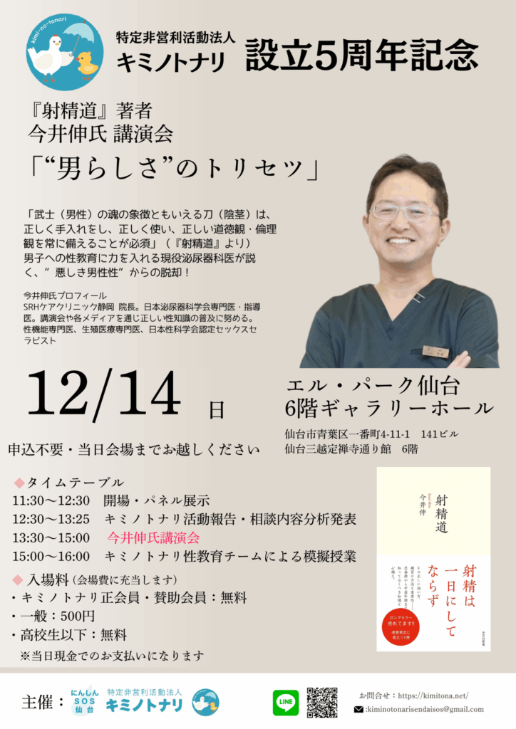 特定非営利活動法人キミノトナリ設立5周年を記念して、『射精道』の著者、今井伸氏の講演会「“男らしさ”のトリセツ」を行います。